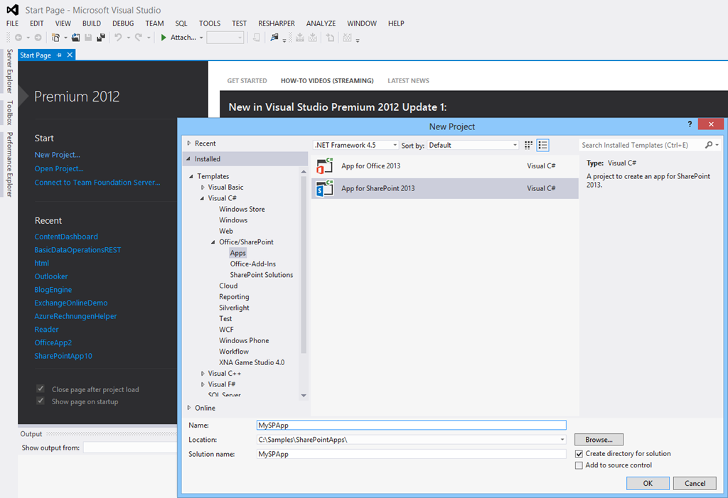 Zuerst legen wir ein neues Projekt aus dem Template “App for SharePoint 2013” an: