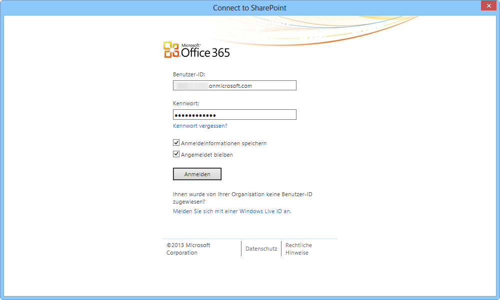 Beim Anklicken von Validate folgt die Anmeldung an der Office 365 Developer Site. Hier am besten den Schalter [x] Angemeldet bleiben markieren: