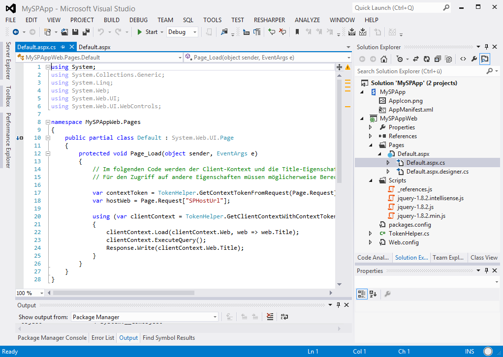 Wir erhalten eine Basis-App – mit Authentifizierung in Page_Load. Verwendet werden Klassen auf TokenHelper.cs und es werden u.a. Referenzen von Microsoft.SharePoint.Client und Microsoft.IdentityModel verwendet. Beim Typ AutoHosted kann CodeBehind verwendet werden, hier das ganze Projekt im Überblick – mehr ist es nicht: