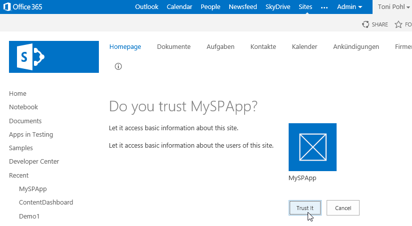 Starten mit F5: SharePoint fragt nach, ob der Benutzer der App vertraut, nach dem Motto: Alles zulassen - oder auf die App verzichten. Dazwischen gibt es keine Auswahlmöglichkeit. D.h. um die App zu verwenden, muss man “Trust it” auswählen.