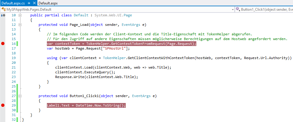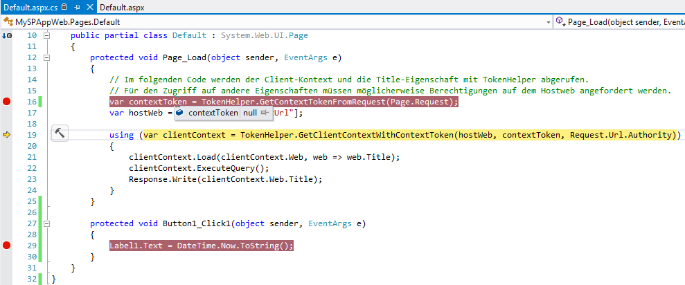 Der geänderte komplette CodeBehind sieht also so aus. Zusätzlich setzen wir noch einen Breakpoint auf die erste Codezeile in Page_Load und einen auf die Codezeile in Button1_Click1.