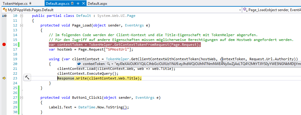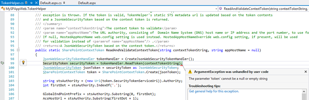 Der *contextToken *ist null. Beim Fortsetzen kommt dann der Folgefehler in TokenHelper.cs:
