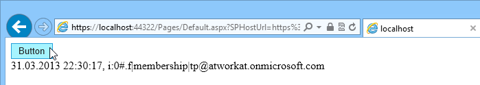 Label1.Text = DateTime.Now.ToString() + ", " + ClientContext.Web.CurrentUser.LoginName.ToString();