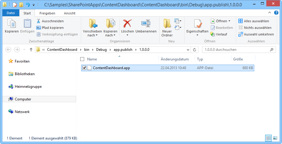 Bei einer SharePoint-App erhält man ein .app-Paket wie hier (z.B.: …\SharePointApps\ContentDashboard\ContentDashboard\bin\Debug\app.publish\1.0.0.0).