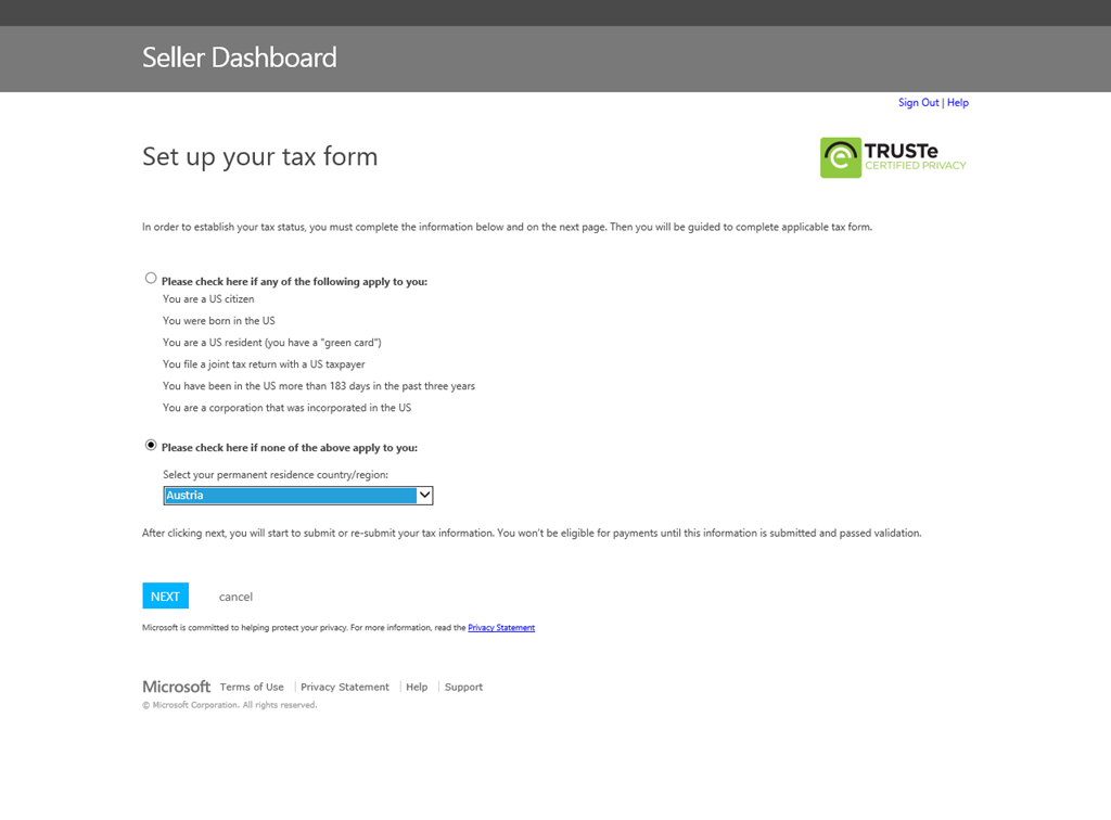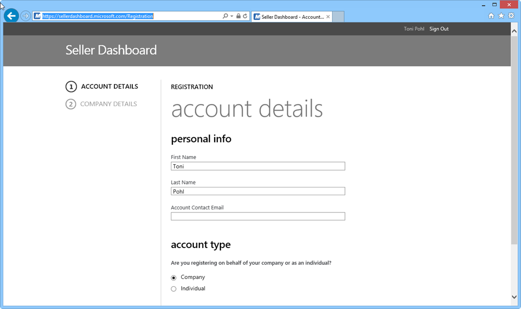 Wichtig hierbei: Wenn man “Company” wählt, muss eine zweite Person “company reference” angegeben werden. Diese erhält dann eine E-Mail zur Bestätigung. Allerdings ist es damit noch nicht getan: Ein Microsoft-Vendor (Symantec, mssupport@symantec.com) ruft danach in der Firma an um zu verifizieren, dass es diese Person gibt und die Anmeldung ok ist. Erst dann wird das Microsoft Konto für das Sellerdashboard freigeschalten. Bei der Registrierung als “Individual” entfällt diese Art der telefonischen Verifizierung.