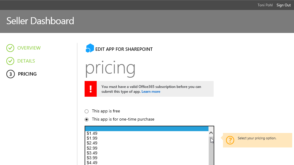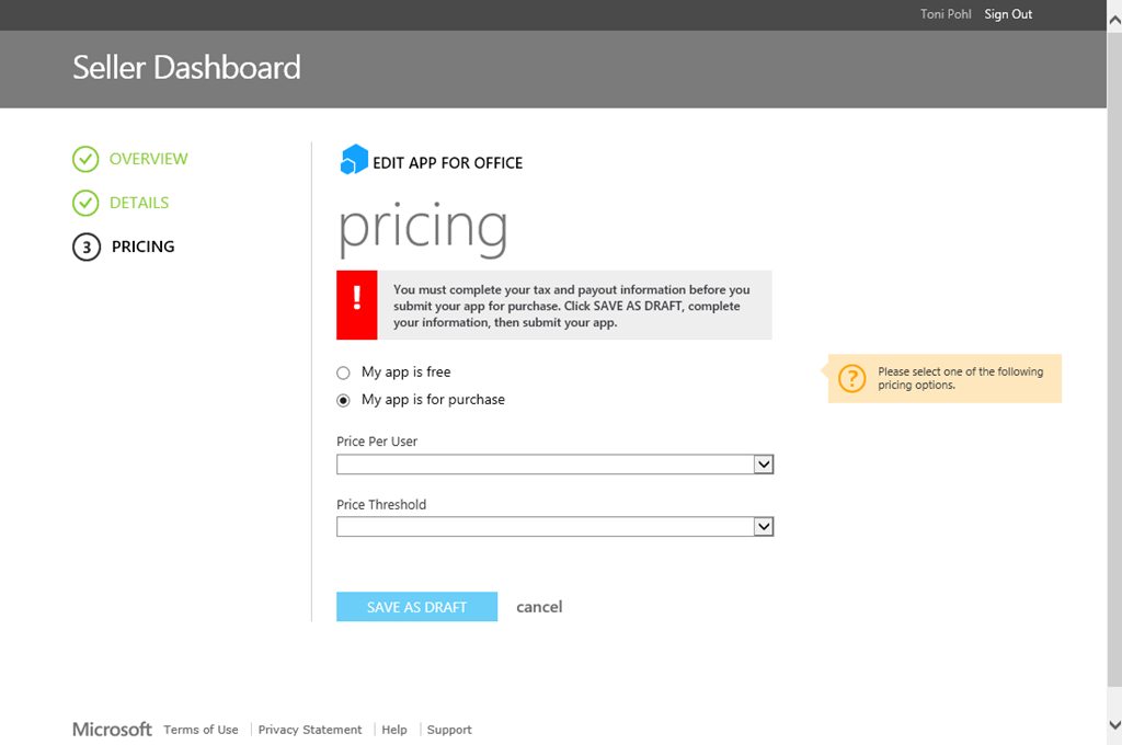 Der Genehmigungsprozess für eine App funktioniert genauso wie vom Microsoft Windows Store oder Windows Phone Store gewohnt: Die App wird hochgeladen und es müssen Titel, Beschreibung, Logo und Screenshots angegeben werden. Dies geschieht in den drei Formularen Overview, Details und Pricinig.
