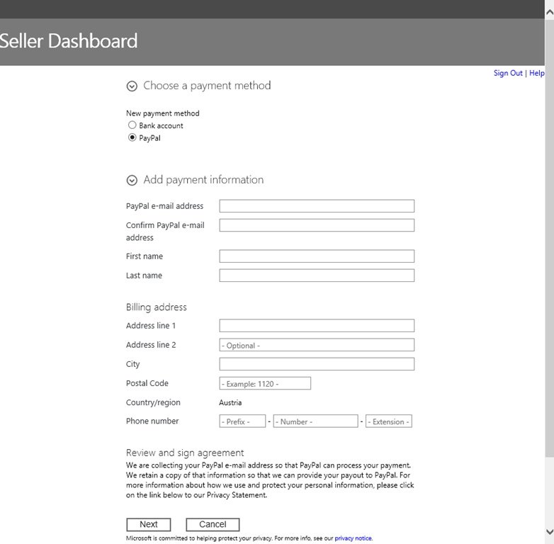 Damit auch kostenpflichtige Apps eingereicht und angeboten werden können, müssen für das Konto die Finanzinformationen im “account” angegeben werden. Es kann ein Bankkonto oder ein PayPal Konto verwendet werden. PayPal ist für uns in Europa wohl der einfachere Weg…