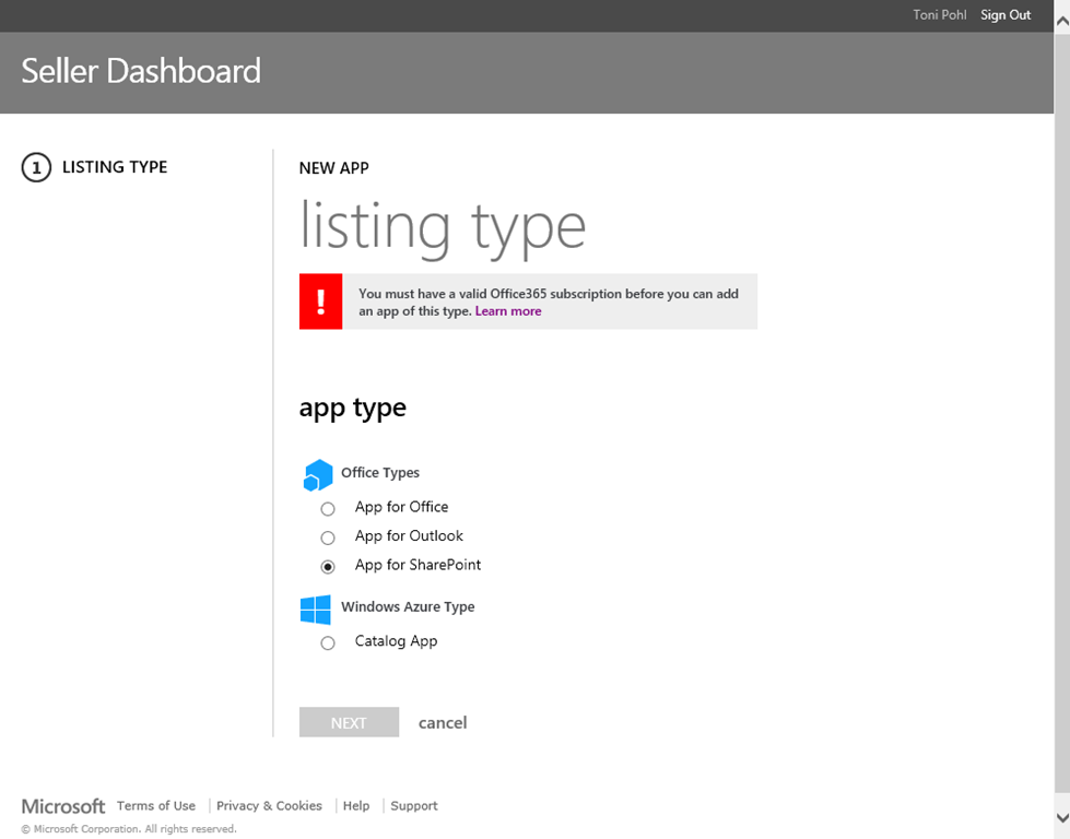 Das SellerDashboard zeigt die Meldung “You must have a valid Office365 subscription before you can add an app of this type. Learn more”, wenn noch keine Office 365 Subscription hinterlegt wurde.