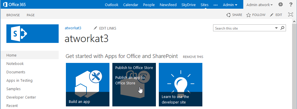 - Am Office 365 Portal anmelden und ein SharePoint Portal vom Typ Developer Site aufrufen (wenn keines vorhanden ist, eine neue Website Collection mit dieser Vorlage erstellen). Wenn es in der Subscription mehrere SharePoint Portale mit der Vorlage “Developer Site” gibt, spielt es keine Rolle, welches Portal man verwendet.