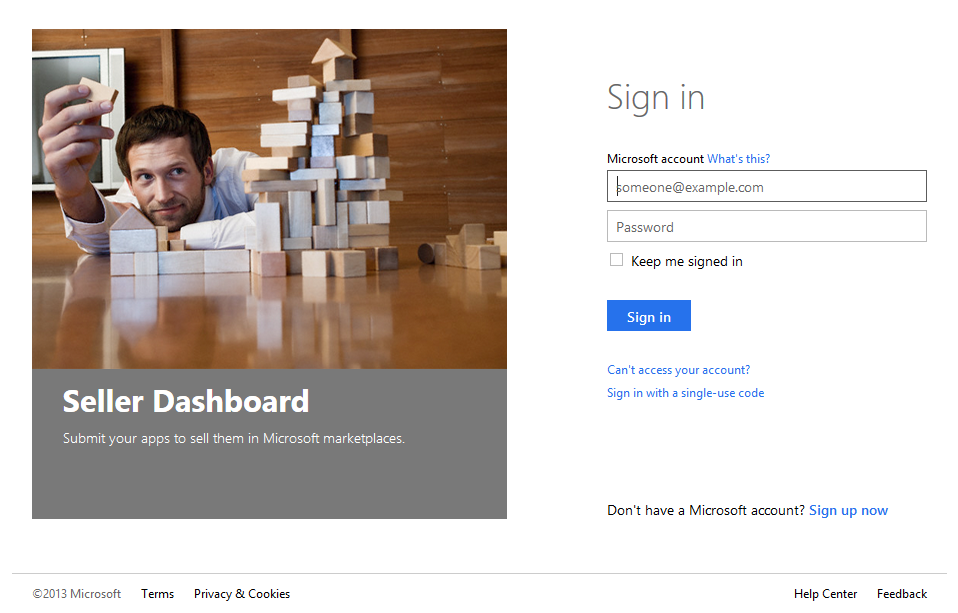 - Es folgt eine Weiterleitung zur SellerDashboard-Login-Seite: Hier mit dem Microsoft Konto anmelden, welches für das SellerDashboard verwendet wird (siehe Teil 5). Tipp: “Don’t use your Office 365 account, which you use to sign into your Developer Site, and which typically ends in @yourcompanyname.onmicrosoft.com.”
