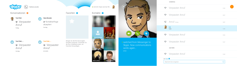 Der Client für den Touchmodus von Windows 8 macht einen übersichtlichen und stabilen Eindruck. Anrufe sind einfach möglich, die Kamera schaltet bei Bedarf hinzu. Durchaus sehr tauglich um schnell einmal über Skype zu kommunizieren. Kontakte können angerufen bzw. zurück gerufen werden.