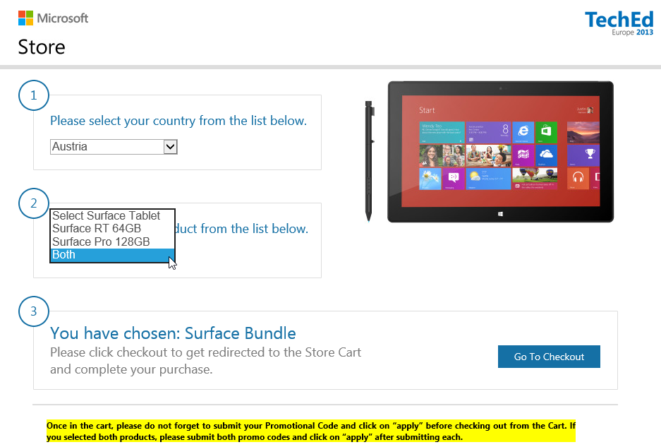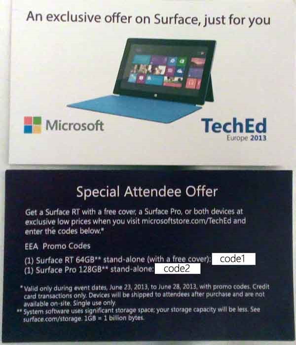 Alle TechEd Europe Teilnehmer können je ein Microsoft Surface RT und ein Surface Pro zu einem sehr stark vergünstigten Preis bestellen, siehe TechEd Europe Super Surface Angebot. Wenn Sie TechEd Teilnehmer sind, erfahren Sie hier, wie das funktioniert. Das Angebot gilt ausschließlich für TechEd-Teilnehmer, alle anderen können die Surface-Geräte natürlich “normal” im Microsoft Online Store bestellen.