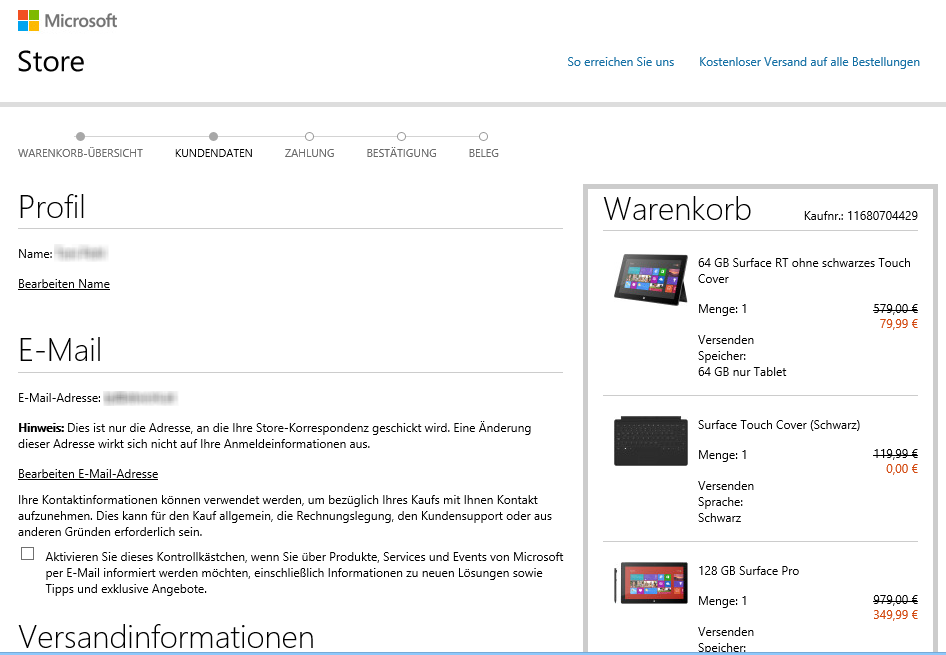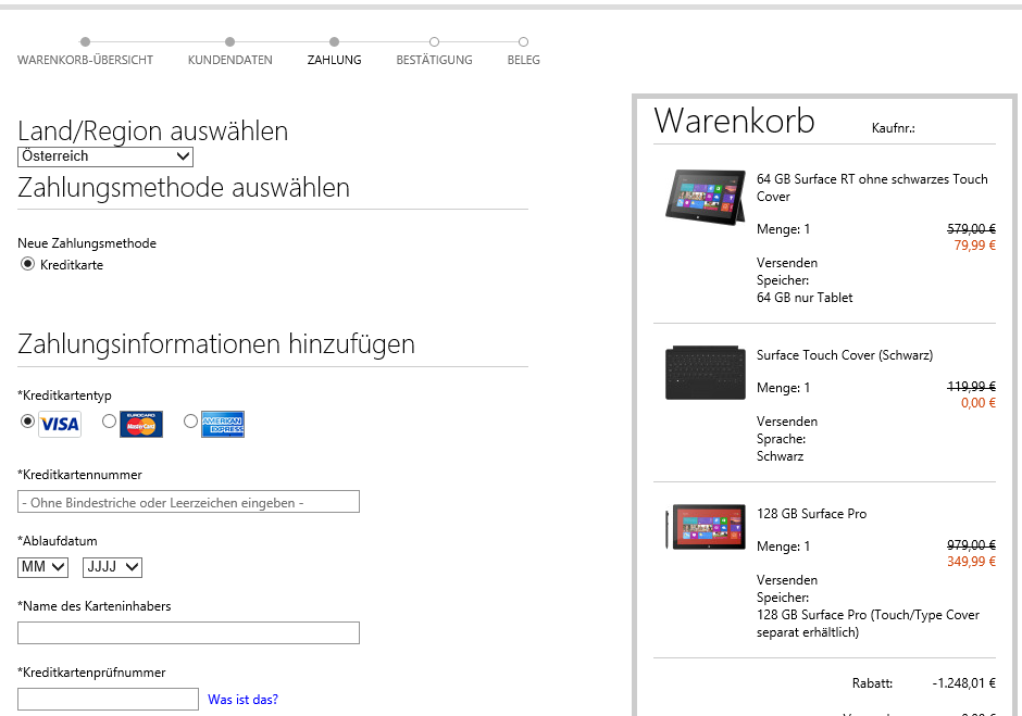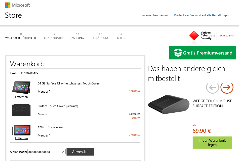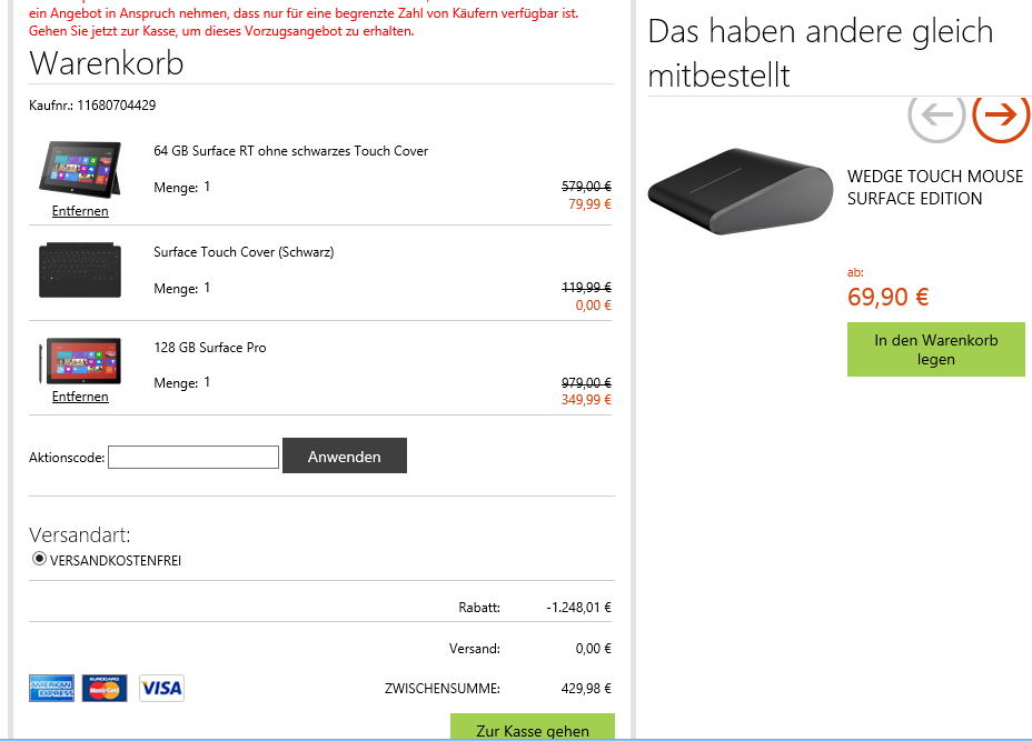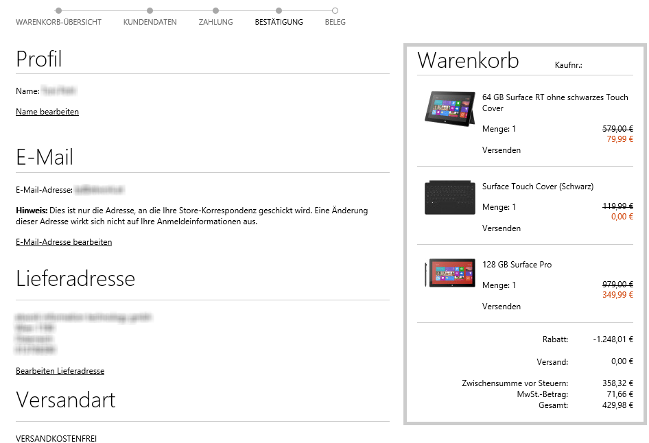 Die Gesamtsumme für beide Surface Geräte beträgt dann 429,98 €.