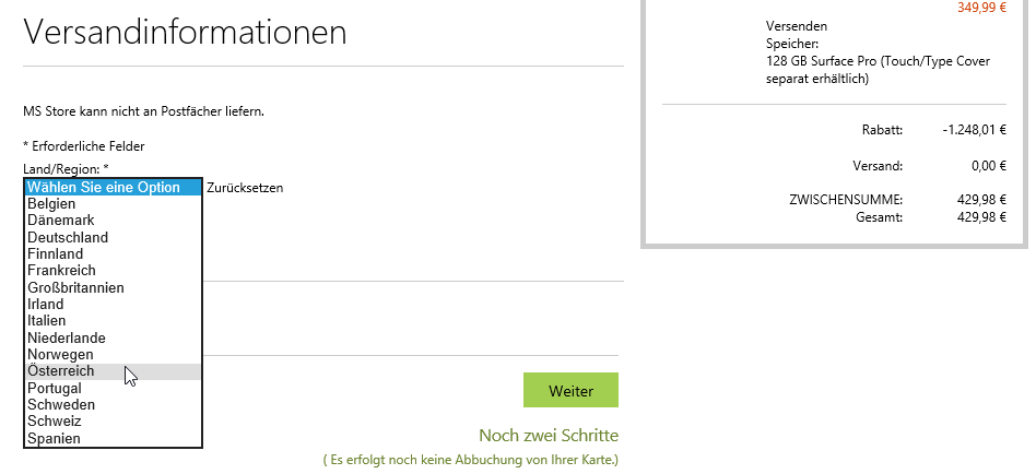 Wichtig: Das Surface-Angebot kann nur in jenen Ländern genutzt werden, wo Surface erhältlich ist: