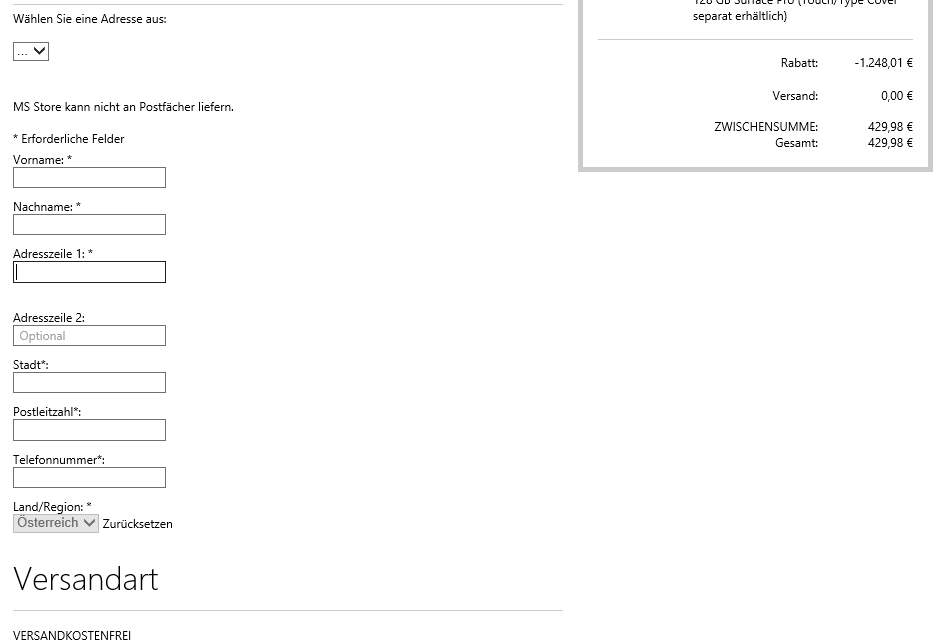 Nach der Land-Auswahl muss die Adresse eingegeben werden: