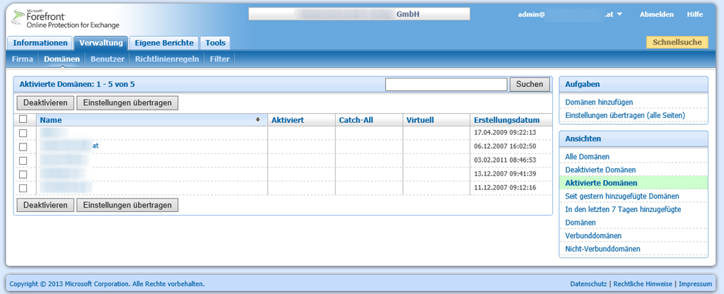 Wichtig: FOPE wird ab April 2013 in EOP integriert, bzw. die Services werden ab April konsolidiert. Für Administratoren bedeutet das, dass die Verwaltung einfacher wird, da damit auch EOP über https://portal.microsoftonline.com verwaltet werden kann. Für Kunden, die bereits Office 365 verwenden erfolgt die Umstellung im Rahmen der Transition zu Office 365 W15. Bei Kunden mit einem On-Premises Mailsystem erfolgt die Transition ab dem 3. Quartal 2013. Die FOPE Einstellungen werden automatisch in EOP auf Office 365 umgestellt. Alle Kunden erhalten mindestens 30 Tage vorher eine Info bezüglich der Transition.