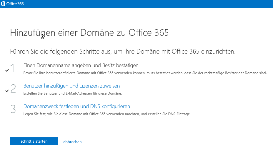 Wenn Sie jetzt erst Ihr Office 365 Account eröffnen, können Sie in diesen 30 Minuten das Office 365 Abo kaufen und die Domain hinzufügen, validieren und die MX-Records ändern.