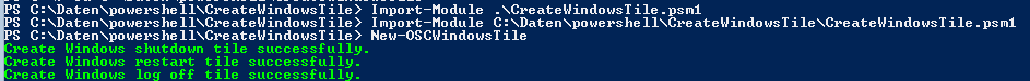 Um nun eine Kachel für herunterfahren, Abmelden und Neustart zu erzeugen, tippen Sie einfach New-OSCWindowsTile