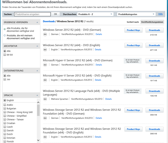 Ebenso sind Windows Server 2012 R2 und der freie Hyper-V Server 2012 R2 mit Sprachpaketen verfügbar.