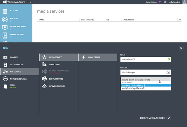 Im Windows Azure wird ein neues Media Service in Media Services/Create erstellt. Wählen Sie in den App Services einen Namen, eine Region und ob Sie einen neuen oder einen existierenden Storage Account zum Speichern der BLOBs verwenden wollen.