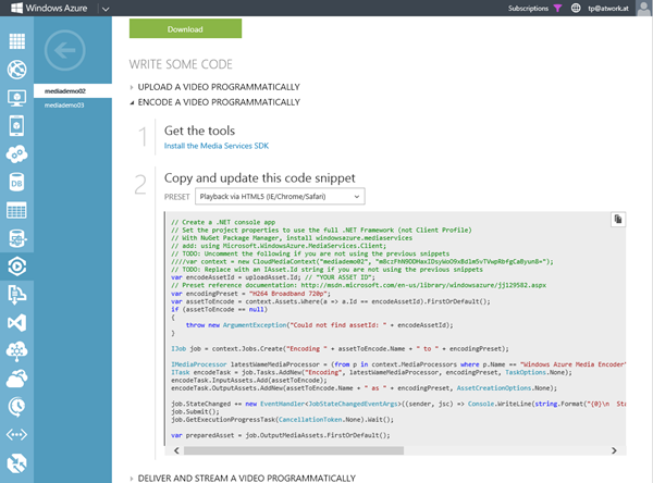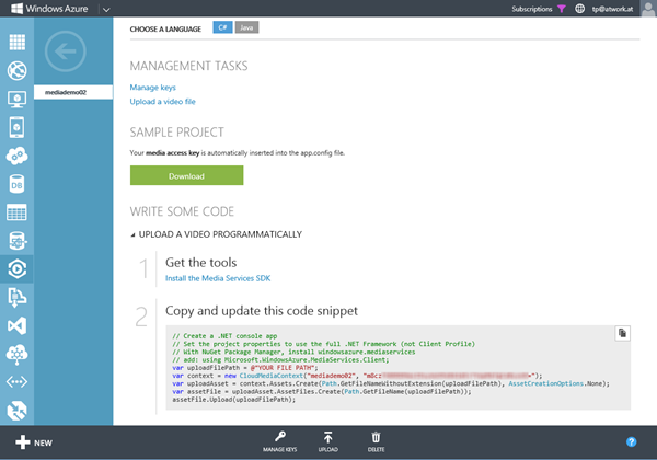 Also kopieren wir den generierten Code. Dieser enthält auch bereits meine Media Services Key.