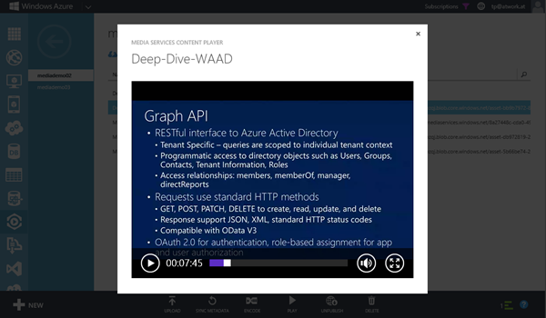 Windows Azure bietet tolle Funktionen um mit Multimedia Inhalten zu arbeiten. Mit Azure Media Services können Audio- und Video-Dateien upgeloadet, kodiert und für Streaming Clients bereitgestellt werden. Eine großartige Methode, um Multimedia Content in eigenen Webs und Apps zu verwenden!