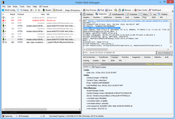 Wenn das Video – beispielsweise in einer eigenen HTML-Seite – läuft, zeigt uns das HTTP debugging proxy tool Fiddler den HTTPS-Tunnel zum Azure Storage. Bei Klicken in eine spätere Position im Video sieht man hier beispielsweise die angepasste “range” von der aktuellen Stelle bis zum Ende.