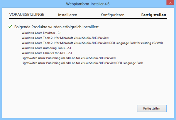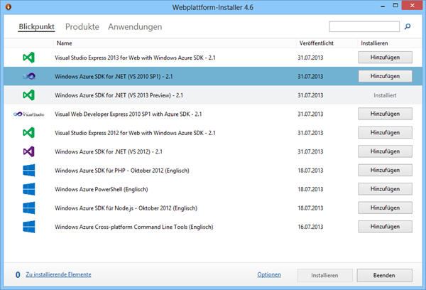 Das SDK 2.1 for .NET (ein kleiner 113KB Loader) kann aus den Windows Azure Downloads heruntergeladen werden. Sofern noch nicht vorhanden, kommt der Web Platform Installer 4.6 gleich mit.
