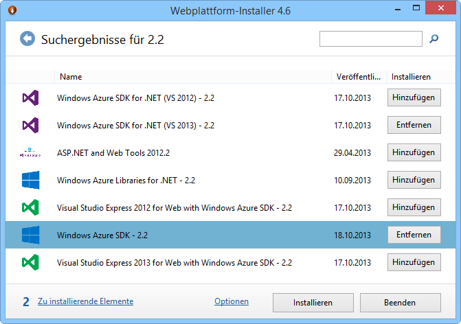 Installiert wird das SDK 2.2 über den aktuellen Webplattform-Installer von Microsoft/web: