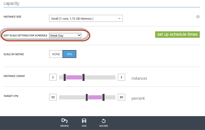 Die Funktionen für geplantes Auto-Scaling von Websites und Virtual Machines (siehe hier) wurden erweitert. Nun können sogar verschiedene Zeitpläne für Tag und Nacht und Wochentag und Wochenende hinterlegt werden.