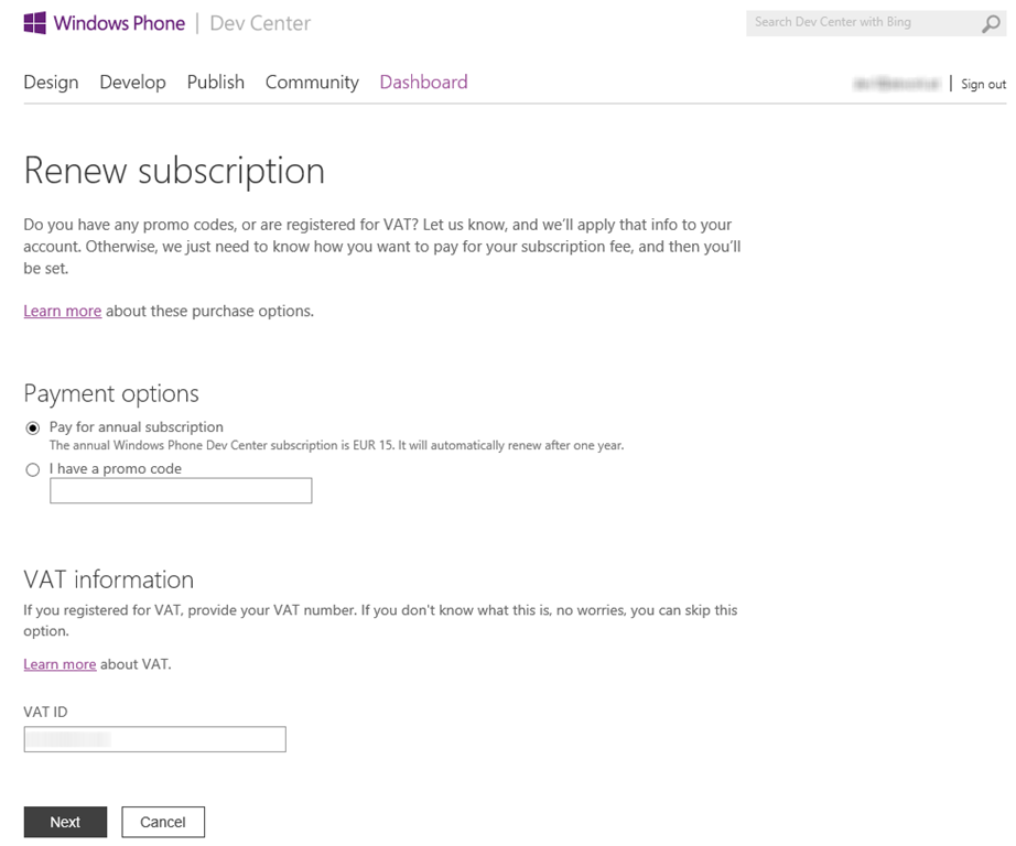 Mit dem Abonnement können bis zu 100 Apps frei veröffentlicht werden, es können kostenfreie und zu bezahlende Apps in den Store eingestellt werden. Es wird eine gültige Kreditkarte, ein PayPal Konto oder ein Promo-Code benötigt. Für DreamSpark Studenten ist die Registrierung kostenfrei.