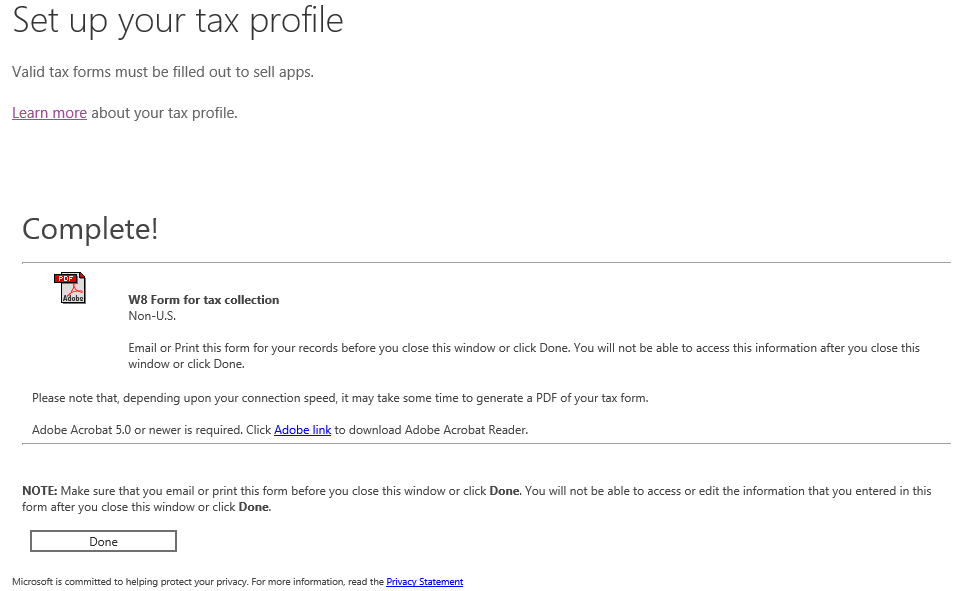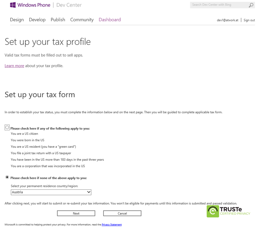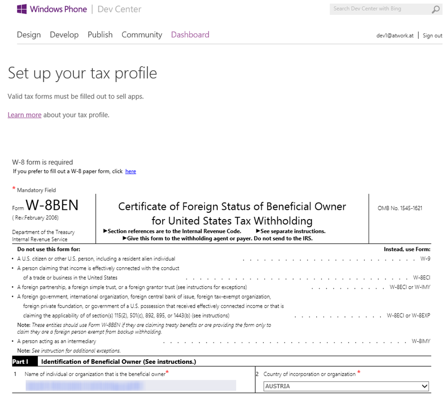 Wenn kostenpflichtige Phone Apps im Store angeboten werden sollen, muss auch das “Tax profile” ausgefüllt werden. Dieser Vorgang ist etwas aufwändiger, daher hier die step-by-step Anleitung dafür. Auf der “Account-Seite” weist das Formular auf fehlende Steuer-Informationen hin.