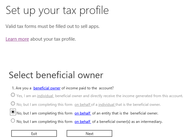 Nun wird die Rechnungsadresse eingegeben. Es folgt die Auswahl des “beneficial owners”, des Eigentümers, der für die Versteuerung zuständig ist. Hier “No, but I am completing this form on behalf of an entity that is the beneficial owner.” auswählen.