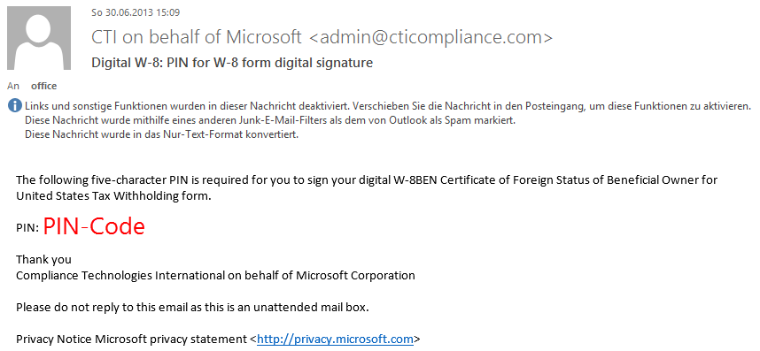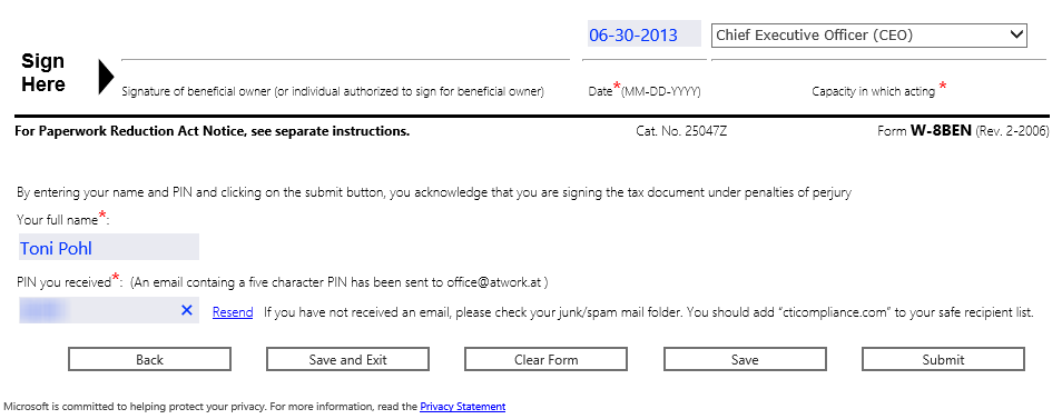 Wichtig: Man erhält eine E-Mail (bei mir im Junk-Folder….) an die angegebene Adresse mit einem PIN-Code. Dieser muss am Formularende gemeinsam mit dem eigenen Namen eingegeben werden.