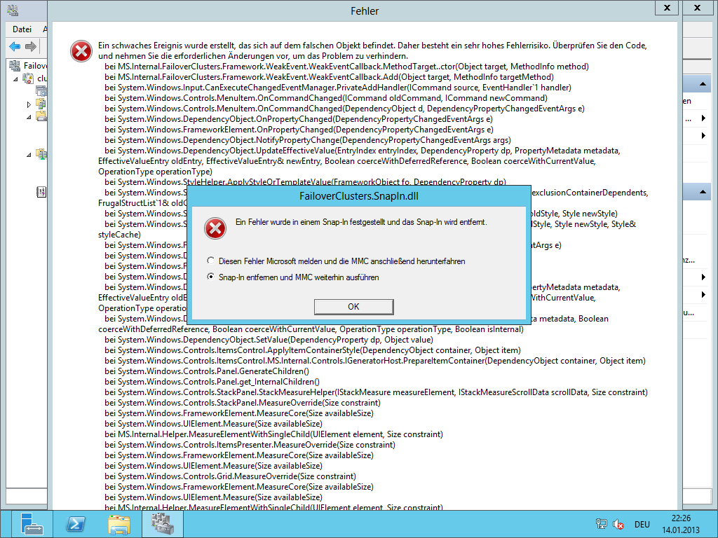 Wer den Windows Server Hyper-V Failover Cluster Manager verwendet, wird wahrscheinlich in dieses Problem laufen – oder schon gelaufen sein: Die MMC stürzt beim Klicken auf Knoten oder Elemente im Cluster Manager mit einer Fehlermeldung “Ein schwaches Ereignis wurde erstellt, das sich auf dem falschen Objekt befindet….” ab. Die MMC kann nur noch geschlossen werden. Die Verwaltung eines Failover Clusters ist somit nicht mehr möglich. Die Fehlermeldung sieht in diesem Fall so aus: