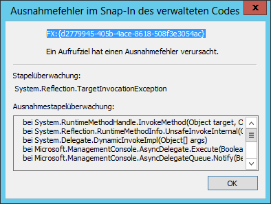 Nach Bestätigen mit OK folgt dann eine weitere Fehlermeldung “Ein Aufrufziel hat einen Ausnahmefehler verursacht.” (Ausnahmefehler im Snap-In des verwalteten Codes):
