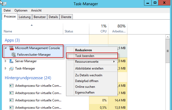 Die MMC bleibt danach hängen und kann nur noch mit dem Task-Manager abgeschossen werden. Das Verhalten ist reproduzierbar und zwar bei jedem (Rechts)Klick auf ein Element im Arbeitsbereich des SnapIns – es ist keine Verwaltung der Failoverclusterdienste mehr möglich.
