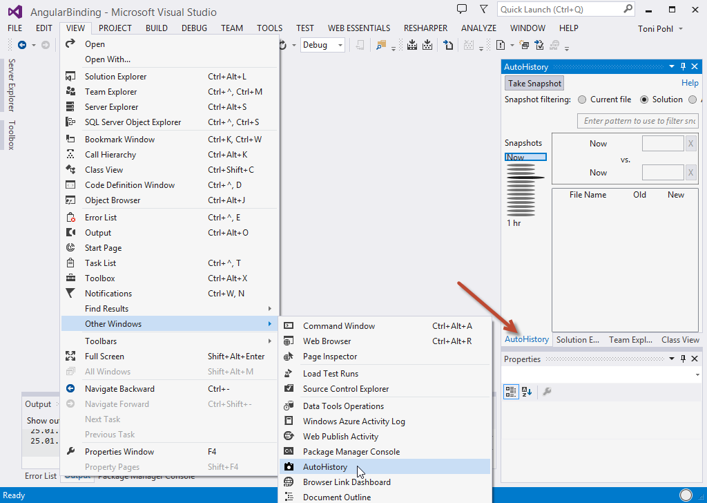 In Visual Studio 2013 wird wie gewohnt gearbeitet. Neu hinzugekommen ist der Register AutoHistory im rechten Projektbereich. Dieser öffnet sich auch gleich nach dem Installieren der Extension. Händisch kann dieses Fenster über das Menü View/Other Windows/AutoHistory jederzeit geöffnet werden.