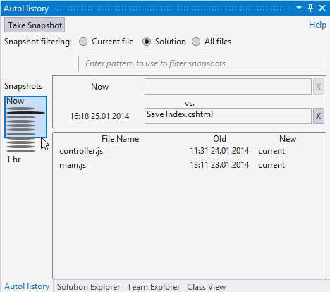 Im AutoHistory-Window kann nun nach Files und Datum gefiltert werden. Durch Ziehen mit der linken Maustaste im Snapshots-Bereich kann jeder Zeitpunkt mit all seinen Änderungen angezeigt werden. Man sieht sofort, welche Dateien zum entsprechenden Zeitpunkt modifiziert wurden.