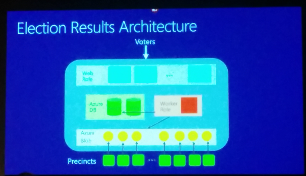 Im Wesentlichen wie im Bild zu sehen - eine Web Rolle, eine Worker Role sowie Database. Die Daten kommen von den Wahlmaschinen direkt in die Azure Blobs, werden vom Worker aufgearbeitet in die Datenbank und dort dann über Web Role wieder abgefragt. Das ganze Fault Tolerant mit zweiter Kopie im zweiten RZ und Azure Traffic Manager als DR Architecture.