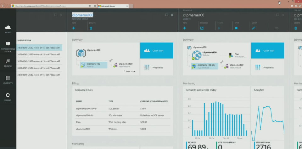 In Keynote Zwei von Scott Guthrie wurden die Developer Highlights vorgestellt, allem voran das neue Microsoft Azure-Portal (bye bye “Windows Azure”) als Preview: https://portal.azure.com. Das neue Portal wird eine Fülle an Informationen in sog. “Blades” liefern und auch viele Analytics Funktionen einbinden, etwa Kosten pro Dienst und voraussichtliche Kosten.