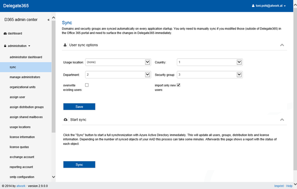 In the menu there´s a new Sync function visible just for portal admins. This opens a page with two sections: “User sync options” and “Start sync” - more about that below (click to enlarge the screenshot).
