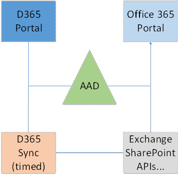 The following graphics shows the components of Office 365 and D365 and the flow of data. D365 and O365 get their data like users, licenses and security groups directly from AAD. For extended data like distribution lists, shared mailboxes, Alias etc. data needs to be requested from other interfaces like from Exchange. So D365 collects data from different sources and combines them in one single-to-use portal.