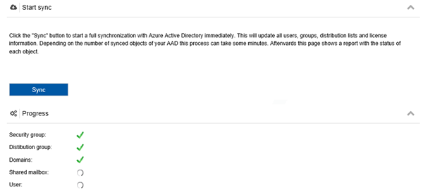 Using Sync is easy: Simply click the “Sync” button. The action starts and shows the progress in the same page even while loading data from the O365 interfaces.