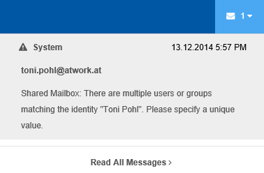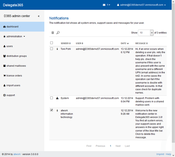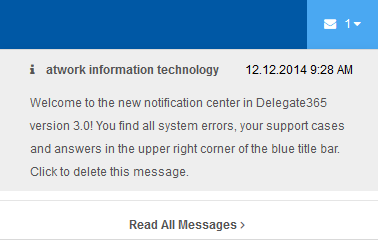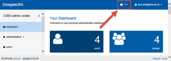 Delegate365 version 3.0 includes a new feature called “notification center”. The notification center is reachable in the upper right corner of the blue title bar. There´s an envelope icon and the number of unread messages next to the logged in user as marked red in the following screenshot.