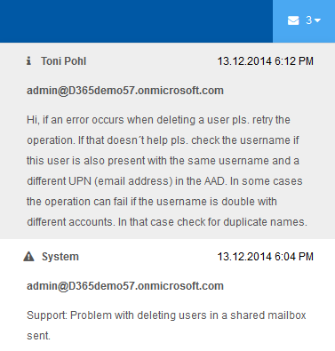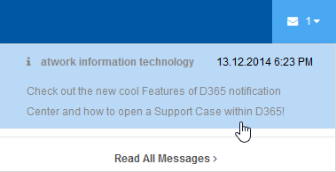 Product Messages: The D365 system center can also send messages to a specific client or to all clients. This will include notifications f.e. if the user limit is reached or when the D365 subscription expires as well as D365 update infos or other important news.