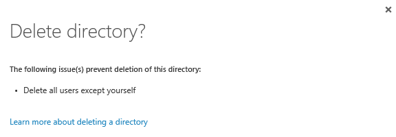 To see the requirements for deleting an Azure AD see Delete AD - Conditions that must be met to delete a directory : … The only user in the directory is the global administrator who will delete the directory.