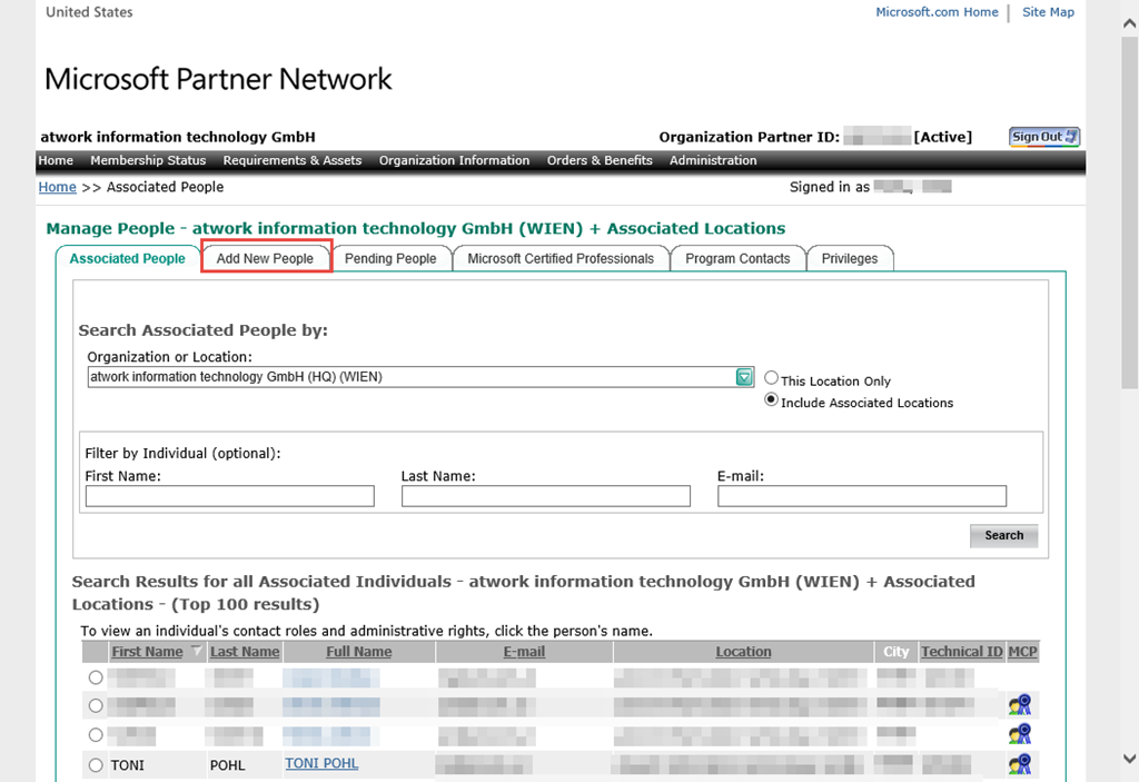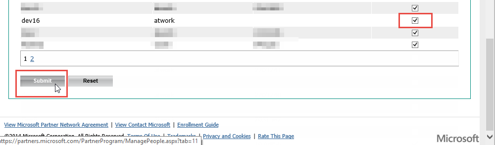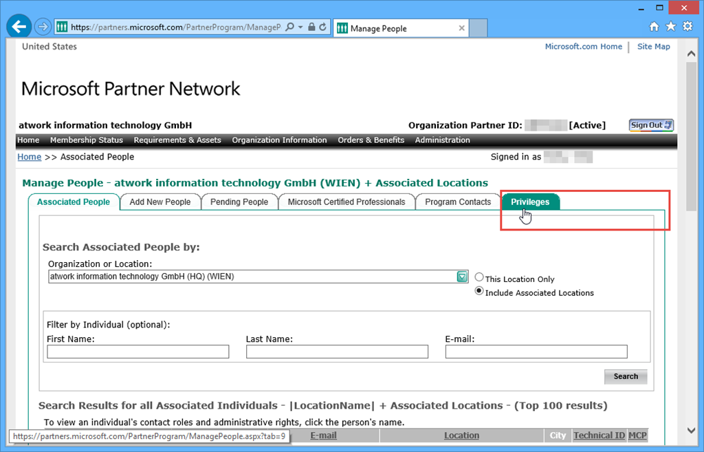 So funktioniert es: Im Partnerportal auf den letzten Register “Privileges” klicken (das ist der Link https://partners.microsoft.com/PartnerProgram/ManagePeople.aspx?tab=9 – also der 9.te Tab).