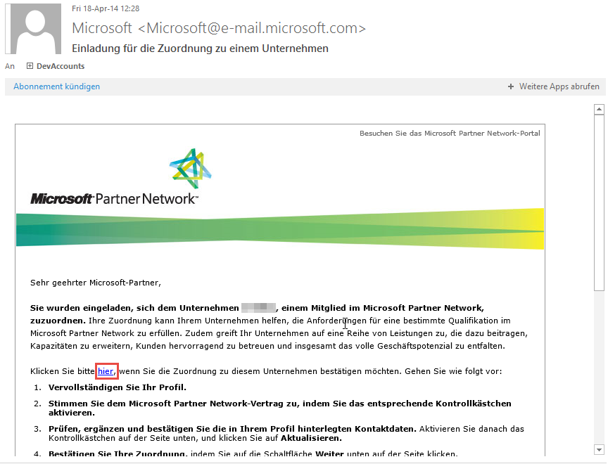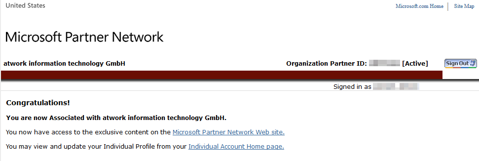 Dies erfolgt sofort. Den Partner-Browser benötigen wir erst später wieder, wenn wir das MSDN-Konto zuweisen (einen Tag später….).