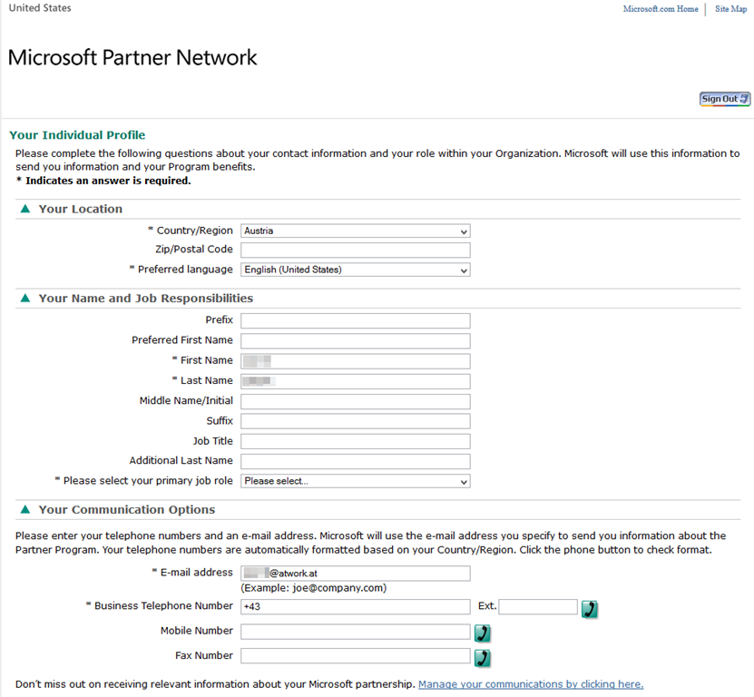…und im (angemeldeten) Browser in einen neuen Tab kopieren. Es folgt (da bereits angemeldet) die MPN Profil-Seite, die noch zu um eine “Job Role”, eine “Business Telephone Number” und das Häkchen “Microsoft Partner Network Legal Agreement” zu vervollständigen ist.